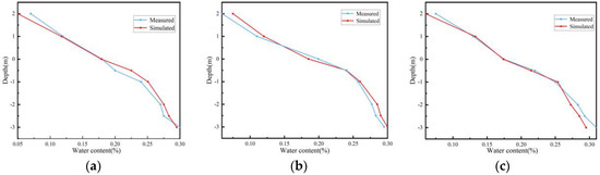 Figure 4 shows the comparison between the simulated and measured values of soil liquid water content during January, February, and March [16]. The results show that the model can relatively accurately reflect the general trend that the water content gradually decreases with increasing depth. At the same time, it reveals significant seasonal changes in water content distribution in different months. Specifically, in shallow-layer soil, water content fluctuations are more obvious due to the greater influence of external climate factors (such as evaporation and precipitation), and there is a certain deviation between the simulated values and the measured values. In deep-layer soil (>2 m), the water content change tends to be stable, and the degree of fitting between the simulated values and the measured values is relatively high, indicating that the model can accurately capture the deep-layer water migration law. As time passes, the degree of matching between the simulation results and the measured data are further improved, verifying the applicability and stability of the model in describing the spatio-temporal distribution and dynamic change process of soil water content, and providing support for research on the influence of freeze–thaw cycles on soil water characteristics.