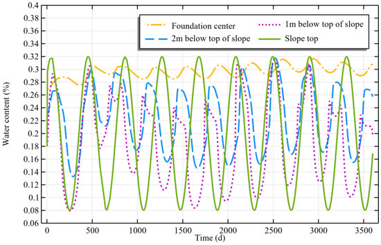 Figure 6 shows the long-term dynamic change law of soil water content with time at different locations, reflecting the significant influence of climate change on soil water migration. The water content in the figure shows obvious periodic fluctuations [with a period of about one year], and there are significant differences in fluctuation amplitudes and phases [12]. Among them, the water content at the top of the slope has the largest fluctuation amplitude, with the lowest value close to 0.08% and the highest value exceeding 0.28%, indicating that the top of the slope is exposed to climate conditions (such as precipitation and evaporation) and is the location with the most drastic water changes. The fluctuation amplitudes of water content at 1 m and 2 m below the top of the slope gradually decrease with the increase in depth, and there is an obvious phase lag, reflecting the influence of soil permeability and hydrodynamic effects on the process of water permeating from the surface to the deep layer. In comparison, the fluctuation amplitude of water content at the center of the foundation is the smallest, about 0.26–0.30%, and the water change is relatively stable, which may be controlled by the groundwater level and lower permeability. The large-amplitude fluctuations in the slope area indicate that it is more sensitive to environmental changes and may become a potential instability factor [12], while the relatively stable water content at the center of the foundation provides safe foundation conditions. In addition, the depth-lag effect of the fluctuations further reveals the time-response characteristics of water migration. Therefore, the accumulation of moisture at the slope toe during both freezing and thawing stages poses a critical risk of collapse. These findings directly inform engineering practices: the real-time monitoring of pore water content at depths of −2–0 m could serve as an early warning indicator for instability and provide a dynamic assessment of seasonal risks, essential for infrastructure design in permafrost regions.