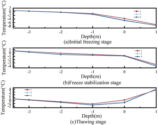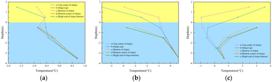 Temperature variation with depth at different freeze–thaw stages of slope. (a) Initial freezing stage; (b) freeze stabilization stage; (c) thawing stage.