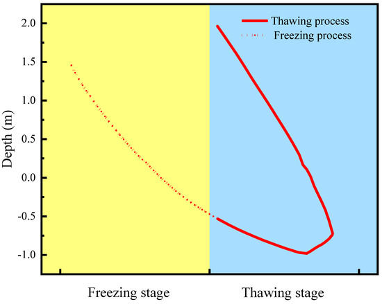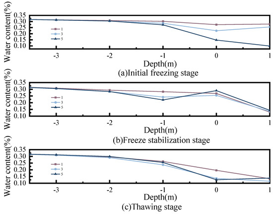 Figure 8 shows the soil moisture content profiles at different freeze–thaw cycle counts and stages. In panel (a), representing the early freezing stage, the moisture content increases gradually with depth, starting from nearly 0% at the top (2 m deep) and reaching about 0.28% at the bottom (−3 m deep). This phenomenon can be attributed to the initial freezing of moisture at the surface due to exposure to low temperatures, resulting in a low moisture content near the surface. In contrast, the bottom region experiences a delayed freezing process due to the lag in heat transfer, maintaining a relatively higher moisture content. Panel (b) shows the stable freezing stage, where the curve demonstrates a gradual change from approximately 0.10% moisture content at 2 m depth to about 0.30% at −3 m depth. This stage indicates that thermal and moisture migration within the system have reached a relatively stable equilibrium, with the moisture content variations between different depths significantly reduced, resulting in a more stable distribution. Panel (c), representing the thawing stage, shows a more complex curve. Starting from about 0.12% moisture content at 2 m depth, the curve initially rises, forming a small peak of around 0.24% near the 0-m depth, and then gradually decreases to about 0.27% at −3 m depth. This complex variation reflects the interplay of several factors, such as the uneven temperature gradient and moisture redistribution during the thawing process, leading to non-monotonic changes in moisture content at different depths and significant peak fluctuations at specific depths [3].