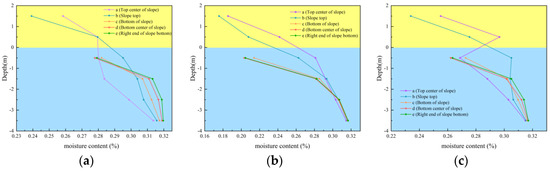 Variation in moisture content with depth at different freeze–thaw stages of slope. (a) Initial freezing stage; (b) freeze stabilization stage; (c) thawing stage.