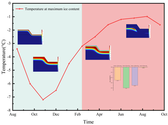 The variation in maximum ice content and its corresponding temperature during the freeze–thaw process of frozen soil slopes is illustrated in Figure 12. From the figure, it is evident that during the freezing stage, as the temperature decreases, water gradually transitions from liquid to solid, forming ice crystals, which leads to an increase in the ice content of the soil. The advancement of the freezing front is accompanied by the accumulation of ice, causing the ice content in the frozen region to continue rising. Simultaneously, the volume expansion of ice induces frost heaving, which leads to the migration of pore water toward the freezing front or infiltration into the unfrozen areas. In contrast, the thawing stage exhibits an opposite trend: as the temperature increases, the ice begins to melt, and the ice content gradually decreases. The meltwater redistributes and infiltrates into other parts of the soil, with the ice content significantly reduced toward the end of the thawing process, approaching zero or the minimum value, indicating that the ice has fully melted, leaving only liquid water distributed within the pores. The bar chart further quantitatively analyzes the variation in maximum ice content, with the freezing stage showing a significant accumulation of ice, while the thawing stage shows a gradual loss of ice. This process may be accompanied by soil subsidence, leading to a significant reduction in soil strength. Overall, Figure 12 reveals the complex coupling relationship between temperature variations, latent heat release during phase changes, heat transfer, and the dynamic distribution of ice content during the freezing and thawing processes.