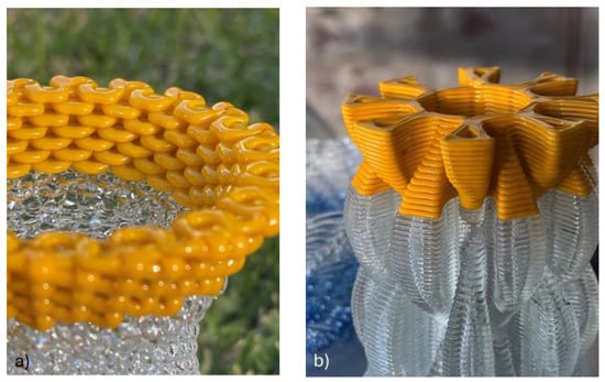 Examples of complex glass structures prepared by additive manufacturing of glass by material extrusion, both utilising translucent Gaffer Glass and opaque yellow-coloured Kugler glass feedstock. (a) Weave toolpath, designed by Mason Meo; (b) spiral ribbon vase, designed by Triple G Workshop.