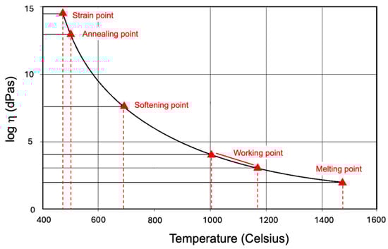 As elaborated in the synopsis of techniques which are being currently explored for glass AM (in the following section), the processes for glass AM utilise the unique thermal behaviour of glass in order to produce an object. This is not coincidental, as the thermal properties of glass have been utilised in glass forming for centuries [9]. The unique relation between temperature and viscosity allows glasses to be shaped in a viscous liquid state. This is depicted in Figure 2, which presents viscosity (for soda–lime glass) as a function of temperature. The range of viscosity (given that the y-axis in Figure 2 is a logarithmic scale) for glass covers more than 12 orders of magnitude over a range of approximately 1000 °C.