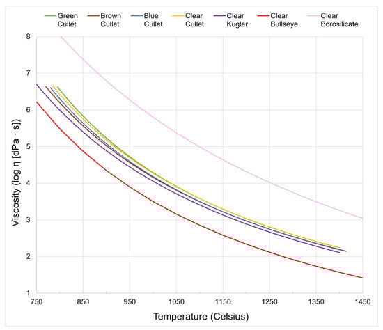 Figure 3 reveals a smaller range of temperatures, and viscosity as a function of temperature, for various common glasses. It can be seen from Figure 3 that there is minor variation in soda–lime glasses (depending on colour, with colour arising from controlled minor/trace changes in glass chemistry), whilst so-called artist glass (such as Bullseye glass) has a lower viscosity across a range of temperatures, and borosilicate glass has a markedly higher viscosity across a range of temperatures. In contrast, quartz glass (SiO2) is a type of glass that does not contain additives, resulting in working temperatures that fall outside the ranges depicted in Figure 3. The results presented in Figure 2 and Figure 3 may also be calculated using a convenient user tool developed by Korber [11]. The tool has a user-interactive web site that draws from the SciGlass database, providing the viscosity and physical property of glasses as a function of their composition.