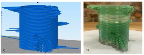 Example of a complex glass structure prepared by extrusion-based additive manufacturing. (a) A 3D representation of the G-code file and (b) the design realised in glass by material extrusion. The glass component reveals the ability to vary colour, and also includes unique, asymmetrical surface detail (design by Noah Shipley (New York, NY, USA)).