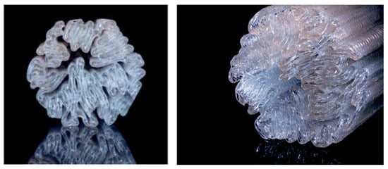 Example of glass structures prepared by extrusion-based additive manufacturing, called ‘brain coral’ (designed by Phirak Suon and Brandyn Callahan (Seattle, WA, USA)). The images indicate internal structures that are asymmetrical, and component complexity that would be tortuous to reproduce using conventional glass production methods.