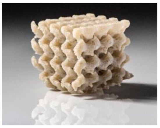 Photograph of a gyroid lattice glass object (20 × 20 × 20 mm2) produced with the SLM process [42].