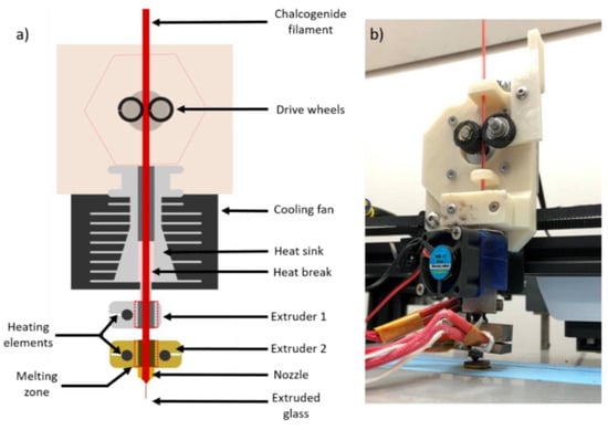Diagram (a) and photograph (b) of the modified chalcogenide glass printing mechanism, attached to a commercial polymer printer. Dual heating elements are used to lengthen the heating zone, allowing better adjustment of glass viscosity during melting. A drive wheel system is used to facilitate the extrusion of rigid filaments [49].