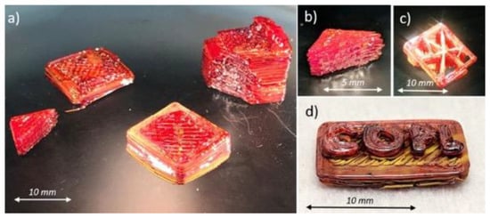 Photographs of various samples produced by EAM with chalcogenide glass. (a,b) Samples intentionally fractured for observation of 100% infill density. (c) A sample with an infill pattern. (d) A sample with text [49].