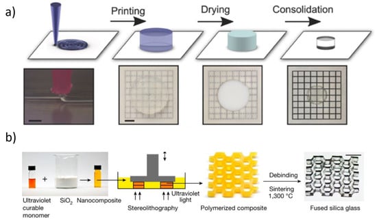 - Cooperstein, I.; Shukrun, E.; Press, O.; Kamyshny, A.; Magdassi, S. Additive Manufacturing of Transparent Silica Glass from Solutions. ACS Appl. Mater. Interfaces 2018, 10, 18879–18885. [Google Scholar] [CrossRef]