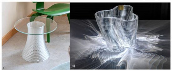 The application of glass AM is not yet widespread in artistic practice, and therefore, what have not been replaced—to date—include traditional analogue techniques. However, glass AM has the potential to remove the associated constraints presently required to digitally translate a derived form into a resulting object in glass. At present, to turn a 3D model into cast glass, a polymeric 3D print is usually created and realised through gravity-based lost-wax kiln casting—a process largely unchanged since its invention many centuries ago. Intermediary materials such as silicone, wax, plaster, and other refractories are used in a sequence of reversals between positive and negative, each process with a loss of fidelity to the original form [17]. In the glass art sector, a gap in knowledge exists, and there is a demand for makers who can realise digitally derived designs and machine-fabricated forming processes. Benefits of the direct production of 3D forms via the additive manufacturing of glass include the following: