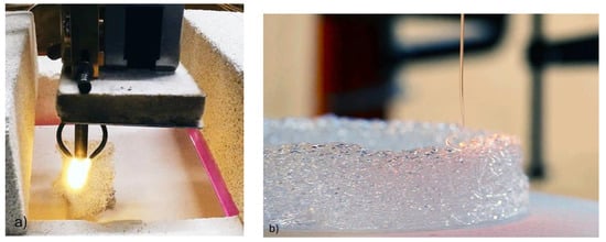 Depicted in Figure 7a, the DED process proceeds by focusing the energy source to generate a pool of molten glass, to which additional feedstock can be added. Via computer numerical control, the melt pool is scanned across a user-defined path with the continuous addition of feedstock, depositing a pattern of fused glass. The currently explored DED techniques are mainly ‘2.5D’ in nature, where the heat involved in deposition fuses single layers of material to previous layers. Some non-planar deposition techniques have been explored [26,27] but are still in their infancy at the time of review.