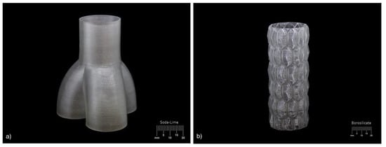 Overall, the unique combination of properties offered by glass makes it an indispensable material in numerous industries and everyday applications. Glass has made numerous contributions historically [1] and continues to contribute significantly to modern life and technology. The principal production routes for glass are presently the float glass process, glassblowing, and flameworking techniques. The float glass process involves pouring molten glass onto a bath of molten tin, resulting in a uniform sheet. Glassblowing involves shaping molten glass by blowing air into it through a blowpipe, allowing intricate shapes and designs by either manual manipulation or formation with a mould. Flameworking operates in a similar manner, instead softening glass for manipulation with a flame. Whilst there are exceptions to these processes (i.e., the formation of glass bricks, or glass fibres), fabrication methods for glass have not been greatly disrupted in a manner similar to other industrial materials. The relatively recent emergence of the additive manufacturing (AM) of glass presents significant advances for glass as both a primary and secondary (i.e., reinforcing) material. The review herein is concerned with the use of glass as a primary material [2,3,4,5]. For example, an additive manufacturing process could potentially produce complex components exclusively from glass and potentially reveal a new paradigm in the way glass is utilised. Examples include complex shapes, load bearing structures, components that incorporate free space, and ‘mechanical metamaterials’ [6], with examples presented in Figure 1.