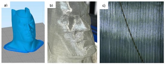 This outer layer, as depicted in Figure 9, has poor transparency, causing printed objects to lack the typical aesthetic qualities desired in a glass object. Based on research presented to date in the field, it appears that a postprocessing procedure such as mechanical or flame polishing is needed for SLM-produced objects with specific aesthetic or optical requirements (although such postprocessing methods are not yet widely explored). Such surface modification/polishing procedures ultimately limit the complexity of models, as they then require adequate access to all surfaces. The poor fusion in this process also raises the need to better understand the mechanical stability of glass objects prepared by SLM. Defects within the solid object create points for stress concentration, increasing the likelihood of fracture. The flexural testing of SLM-produced samples has shown strengths significantly lower than those of float glass of a similar material [42]. This presents issues with objects of significant scale, as the weight of the object itself may exceed the inherent strength of the object possible with this technique. This merits a brief comment that metal–glass hybrids, where the proportion of glass powder was no more than ~30% in a glass–metal powder blend, have been successfully produced using SLM [47]. In the work, the resulting objects following fusion were metallic, with glass metallurgically fusing with the (majority) metallic feedstock.