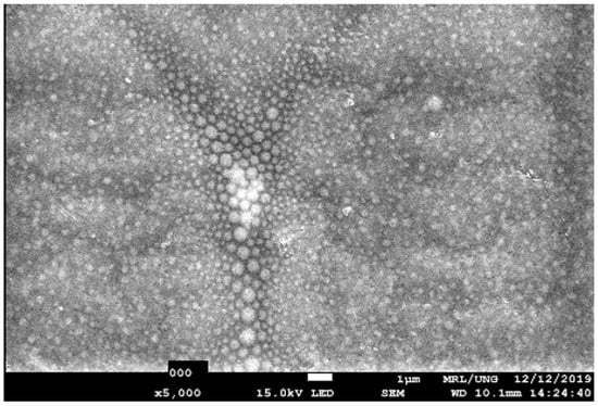 The SEM images of the investigated samples were recorded using a scanning electronic microscope (JSM 7001, JEOL). The measurements were performed under a pressure of 50 Pa and operating conditions of 15 kV, 8–10 nA, and an emitted beam of 1 μm in diameter. To avoid charging the sample during measurements, it was coated with 5 nm of Au/Pd layer. The SEM image of the Si-PBMA sample is presented in Figure 1.
