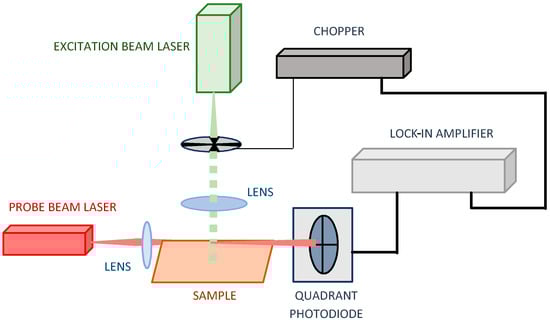 The source of the excitation beam was a solid-state laser (532 nm, 30 mW) (GoPhotonics, BWI-532-10-E/66966, New Delhi, India). The excitation beam was intensity-modulated at 3–30 Hz by a variable-speed mechanical chopper (Scientific Instruments 300CD, 300C and 300H model). The source of the probe beam was a Helium–Neon laser (633 nm, 3 mW) (Uniphase, Model 1103P, St. Charles, MI, USA). The probe beam (PB) and the excitation beam (EB) were formed properly using bi-convex, AR-coated lenses (350–700 nm, Edmund Optics). The excitation beam was formed by a lens with a 100 mm focal length to be defocused to a spot size of around 2 mm2 on the sample surface, which determines the spatial resolution of the BDS imaging. The probe beam was focused by a lens of 40 mm to form a probe beam waist over the examined sample, which ensures a 1D experimental configuration (PB size << EB size in the area of TOs) []. The probe beam intensity change was detected by QPD (RBM–R. Braumann GmbH, Model C30846E, Attenkirchen, Germany) with the interference filter in front of it (CWL 633 nm, Edmund Optics). The BDS signal was measured by a lock-in amplifier (Stanford Research instruments, Model SR830 DSP). The 3D movement of the sample was made possible by the translation stage (CVI, Model 2480M/2488, Albuquerque, NM, USA) due to the geometrical configuration of the system being optimized.