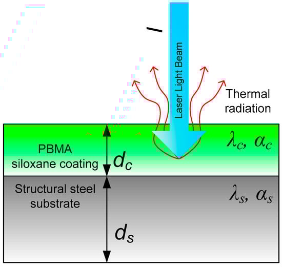 The Modulated Photothermal Radiometry basics are presented in detail in the literature [,]. This method involves the illumination of the sample by an intensity-modulated beam of laser light. When the material is illuminated by a light beam, it absorbs energy, and its temperature increases. The temperature of the material is directly related to its thermal and optical properties, such as thermal conductivity, diffusivity, capacity, and optical absorption. As a result of the optical absorption of this light, periodical temperature waves arise in the sample, too. By measuring the thermal emission from the material using a sensitive detector, information about its internal structure, composition, and properties can be obtained. A simplified schematic of the investigated samples consisting of two layers, i.e., the PBMA–siloxane coating deposited on the substrate, is presented in Figure 4.