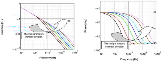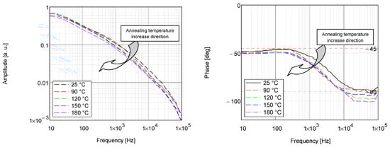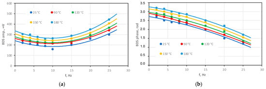Each measurement was repeated three times. The obtained values of thermal properties are expressed as the mean value ± its standard deviation (SD). To perform a statistical analysis of the results’ significance, Tukey’s means test (p ≤ 0.05) was used. As a result of the BDS measurements, the signal amplitude and phase characteristics as a function of the EB frequency of modulation were collected (Figure 14).