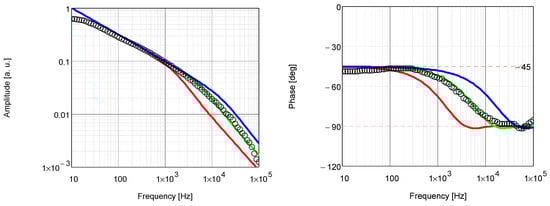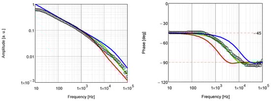 Theoretical (lines) and experimental (circles) PTR amplitude and phase frequency characteristics. They were obtained for the PBMA–siloxane coating annealed at 25 °C. Characteristics shown with the solid green line were computed for (αc, λc), those with the solid blue line were computed for (3·αc, 3·λc), and those with the solid red line were computed for (αc/3, λc/3).