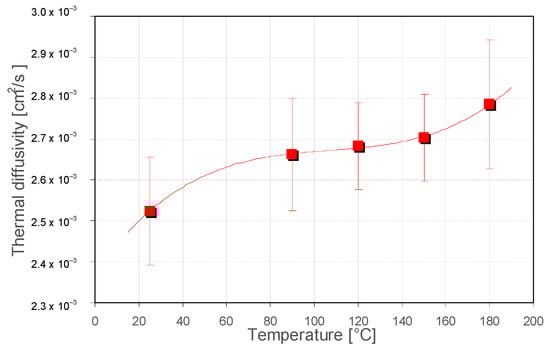 With the increase in the annealing temperature values from 25 °C to 180 °C, the thermal diffusivity values changed from 2.52·10−3 cm2·s−1 to 2.78·10−3 cm2·s−1 and from 2.55·10−3 cm2·s−1 to 2.73·10−3 cm2·s−1 with the use of the PTR and BDS methods, respectively. The thermal conductivity values of the same samples changed from 3.02·10−3 W·cm−1·K−1 to 3.48·10−3 W·cm−1·K−1 and from 2.99·10−3 W·cm−1·K−1 to 3.56·10−3 W·cm−1·K−1 with the use of the PTR and BDS methods, respectively. Finally, the thermal effusivity changed from 6.01·10−2 W1/2·cm−2·K−1 to 6.61·10−2 W1/2·cm−2·K−1 and from 5.92·10−2 W1/2·cm−2·K−1 to 6.81·10−2 W1/2·cm−2·K−1 with the use of the PTR and BDS methods, respectively. The thermal diffusivity, thermal conductivity, and thermal effusivity increased by 9% with the increase in annealing temperature.
