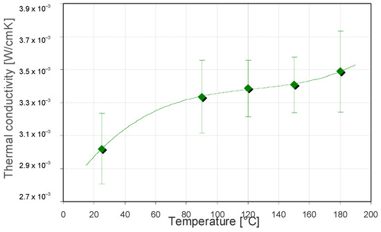 Values of the determined thermal conductivities of investigated PBMA–siloxane coatings annealed at different temperatures. The diamonds are experimental data, and the dashed line is a trend line.