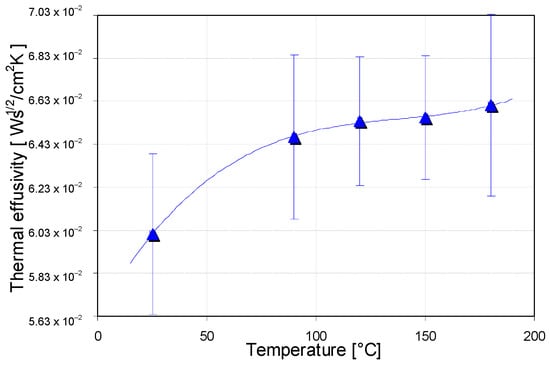 This behavior reflects the changes in material properties that occur as a result of its annealing. The increase in the temperature of the material during sol–gel synthesis causes the breaking of double bonds, thus making the whole material more compact, which also increases its thermal properties []. The increase in annealing temperature from 25 °C to 180 °C results in about a 10% increase in the Si-PBMA coating’s thermal properties, reaching values of 2.785·10−3 cm2·s−1, 3.489·10−3 W·cm−1·K−1, and 6.61·10−2 W· s1/2 cm−2 ·K−1 for thermal diffusivity, conductivity and effusivity, respectively. These results coincide with those obtained in the literature [].