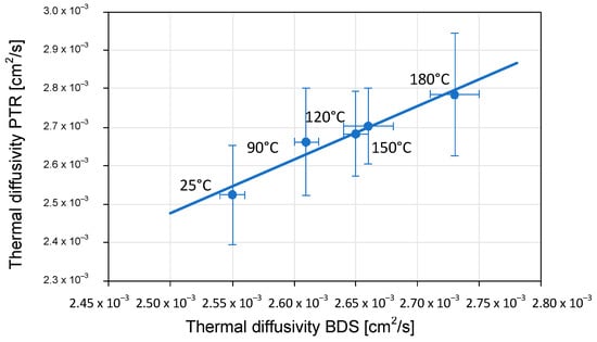 The relationship between the values of thermal diffusivity determined by the BDS and PTR techniques. The filled circles are experimental data, and the solid line is a linear regression line.