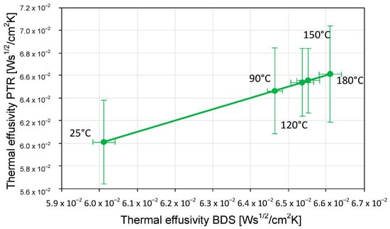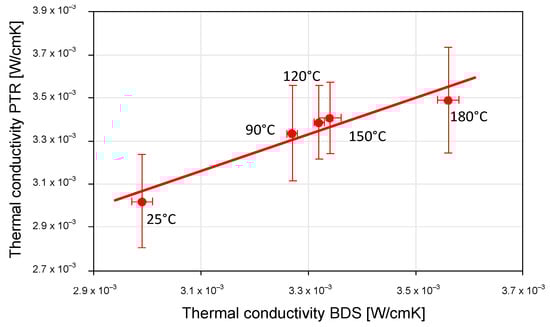 To compare the results obtained by the PTR and BDS methods and determine whether significant differences exist between the values of the thermal properties found using the two techniques, the related p-values were calculated at the 95% confidence level []. No significant differences were observed in the determined values of either the thermal conductivity or diffusivity since, in all cases, the p-value was found to be >0.05, which indicates that the difference between compared properties is not considered to be statistically significant.