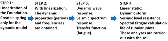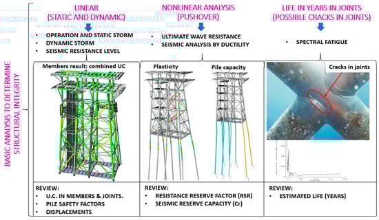 To assess the structural integrity of the platform, six on-site analyses are required, categorized into three groups: (1) Linear analyses, including operational and static storm conditions, dynamic storm conditions, and earthquake resistance levels; (2) Nonlinear analyses, covering ultimate surge resistance and earthquake ductility levels; and (3) Spectral fatigue analysis, as summarized in Figure 2.
