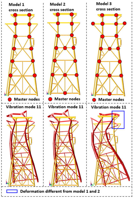 - Model 3: Similar to Model 2, but with additional mass concentrations on diagonal members supporting cantilevers in the topside (see Figure 4). This figure also illustrates the platform deformation in mode 11, revealing similar deformation patterns across models.