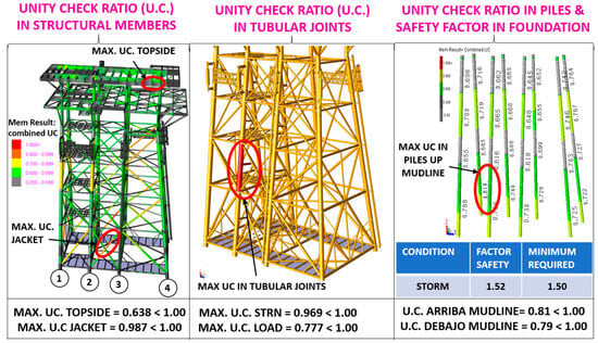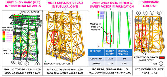 This analysis aims to verify the structural integrity of the offshore platform, ensuring compliance with all applicable regulations regarding loads and stress distributions in both the substructure and superstructure, as well as in the pile foundation system. The results are presented in terms of unity checks (UC), which represent the inverse of the factor of safety, defined as the ratio of the maximum design load to the allowable load. This is also referred to as the utilization ratio, where a UC value below 1.0 indicates that the component meets the required design criteria, as specified in Section 6.2 of API RP 2A WSD 22nd Edition [35].