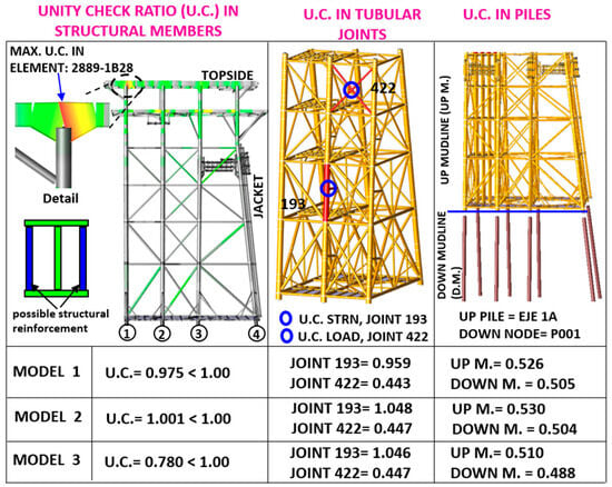 - For the strength-level seismic analysis, different master node configurations were evaluated, highlighting their impact on U.C. assessments in structural elements, tubular joints, and piles. This study proposes reinforcement solutions for elements that do not meet the regulatory requirements.