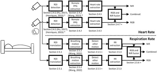 Flowchart of the complete methodology of heart and respiration rate extraction. Details on each processing step can found in the section step beneath each block. An asterisk indicates an adaptation has been made to the existing method [,,,]. A plus sign indicates a new contribution.