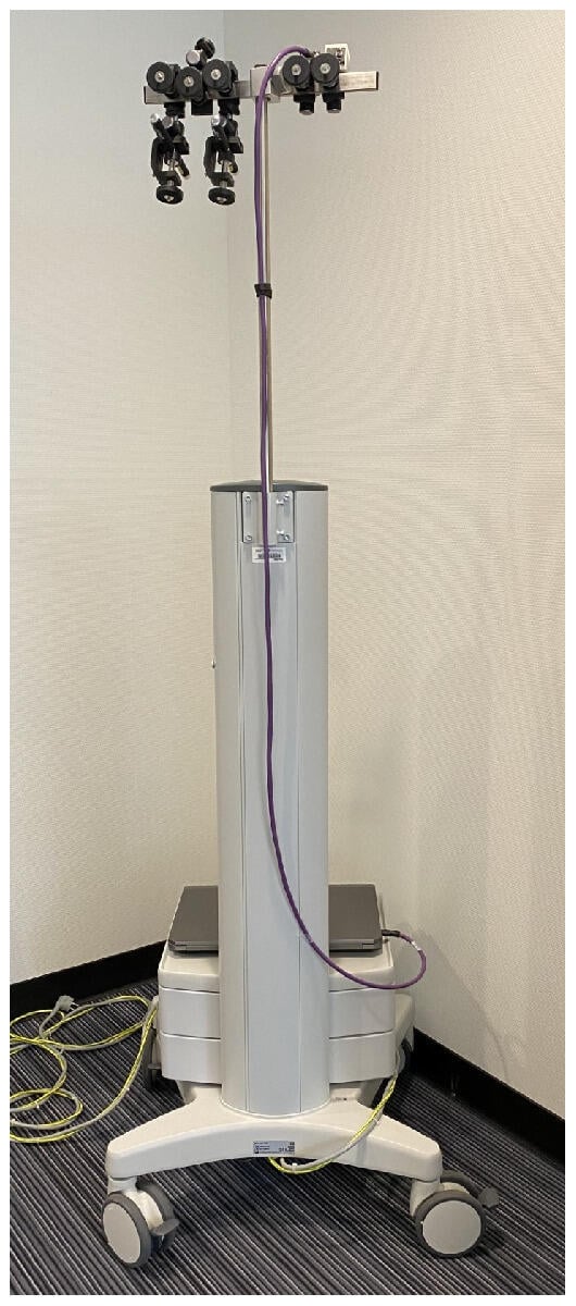 Mounting the cameras above the patient’s bed would be ideal, as they would not obstruct the staff, and the higher angle of incidence could reduce the chance that staff would occlude the view of the patient. However, altering the ICU room to mount the cameras on the ceiling was not feasible for this study. Instead, a mobile camera setup on a medical cart was placed at the foot end of the bed. This allowed a single setup to be used for data collection in multiple ICU rooms, and as the setup was mobile, it could be moved out of the way if needed by the staff. The three cameras and a baby monitor (DVM-71, Alecto, Kerkrade, The Netherlands), of which only the NIR light source was used, were mounted close together on the cart at a height of 2 m and were aimed such that patient visibility could be ensured regardless of bed height and headrest adjustments. Each of the cameras collected approximately 2GB/min of video data for a total of approximately 5.8 TB of video per 24 h per patient. Therefore, a laptop with 8 TB of external storage was used to collect and store video data of one patient. After a recording was finished, the video data were transferred to another storage location and processed offline. Some patients were also seated in a chair next to the bed for a part of the recording, in which case the setup was moved so that they were still within the field of view. If during a recording a moment of privacy was needed, the cameras were covered. The complete measurement setup can be seen in Figure 2.