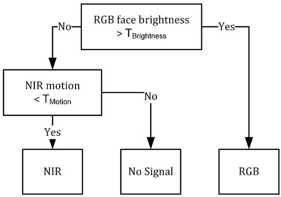 In the brightness range where the RGB camera has no coverage or poor performance, the NIR camera should replace it to ensure coverage in this brightness range. To enable this, we applied the combination strategy detailed in Figure 3. Since the RGB-based extraction is motion-robust and the NIR-based extraction is not, the RGB-based extraction was used above the to-be-determined face ROI brightness threshold. Below the brightness threshold, the NIR measurement was used as long as the patient’s motion was beneath the motion threshold.