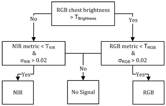 The combination strategy for the respiration rate measurements based on RGB and NIR is shown in Figure 4, where we use and to denote the standard deviation of the breathing motion in a segment. First, thresholds and of the breathing motion metric were selected such that their overall 3 RPM agreement across all patients was 90%. Then, we chose whether to use the RGB- or NIR-based measurement based on the brightness level in the chest ROI; if it was sufficient, the RGB-based measurement was used. Otherwise, the NIR measurement was chosen. We determined the brightness threshold by plotting the overall 3 RPM agreement, MAE, and coverage of both modalities and the combined measurements against the threshold and chose the threshold which yielded the best overall performance.