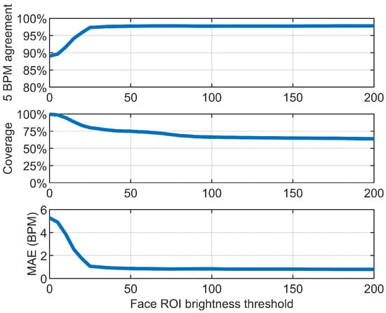 RGB-based heart rate extraction relies on visible light to enable successful heart rate measurements from a patient. As the measurement setup in this work does not include a dedicated visible light source, variations in room lighting, weather, and bed placement in the ICU room can strongly affect the lighting conditions in the room. While we have previously described how we attempted to prevent and combat overexposure of face pixels, there will also be a minimum brightness level at which we can still reliably extract heart rate from RGB video frames. First, we determined the brightness level as the mean across all pixels in the face ROI and the R, G, and B channels. Then, we assessed the 5 BPM agreement, coverage, and mean absolute error (MAE) as we increased a minimum brightness threshold to determine how the RGB-based extraction was affected by the face ROI brightness.