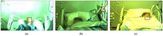Second, upon further investigation of the patients’ RGB recordings, we observe that inaccurate measurements often coincided with the presence of staff and/or visitors in the field of view of the camera. Segments where they occluded the face ROI of the patient were already removed from further analysis, and staff and visitors were present in almost all recordings; as such, further scrutiny was required to arrive at the root cause. Subsequently, we noted that problems occurred most often when the patient was not facing the camera, as is the case in Figure 6a,b. In this situation, the face detector might more easily pick up staff or visitors instead of the patient, or it might not be able to find the patient at all. This alone will cause problems with agreement, since the face ROI is not on the patient. On top of this, the camera might adjust the exposure time using an ROI that does not contain the patient’s face, which could result in a very overexposed face ROI until the exposure time is adjusted again, as is the case seen in Figure 6a. The resulting overexposed image in turn can increase the difficulty of finding the correct face ROI, especially if staff and/or visitors re-enter the field of view, which could perpetuate the situation until the patient is alone in the view of the camera for an extended period of time.