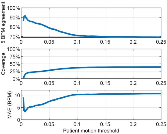 Similar to the RGB recordings, the NIR recordings of patients with an irregular rhythm had inaccurate heart rate measurements; as such, the NIR recordings of the same group of 11 patients had low agreement with the reference. Another observation is that in the case of patient 20, the NIR-based heart rate became inaccurate because of a blinking light that illuminated the patient; the light blinked with a period of 5 s, which is outside of the heart rate range, but one of its higher-order harmonics did fall in the heart rate band at 48 BPM, which caused a peak in the Fourier spectrum which for many segments was higher than the heart rate peak. Furthermore, we also observed that for a large group of patients, the RGB recording never became dark enough to the point where the RGB-based measurement became inaccurate, which means that only a subset of the NIR recordings was relevant for heart rate monitoring. Also, the NIR camera was out of focus for the recording of patients 3 and 16; the resulting blurring of the images influenced the optical flow calculation. Because of this, the optical flow measurement becomes much less sensitive to smaller motion, which could harm the performance of the motion detection. Furthermore, the face detection was affected by this, resulting in a more poorly defined face ROI. Finally, patients 19 and 23 had a problem where the NIR light source was not correctly pointed at the patient, causing inaccurate extraction of the heart rate. In the end, the NIR recordings of seven patients (1, 7, 10, 15, 17, 29, and 34) remained where NIR measurements could feasibly contribute to the coverage of the monitoring system. In Figure 7, we see the overall agreement, MAE, and coverage of the heart rate extraction in these selected NIR recordings plotted against the NIR motion threshold. In the graph, 100% coverage indicates the whole recording. Since the NIR-based measurements were only evaluated where the RGB face ROI brightness was below 25, the coverage did not reach 100%.
