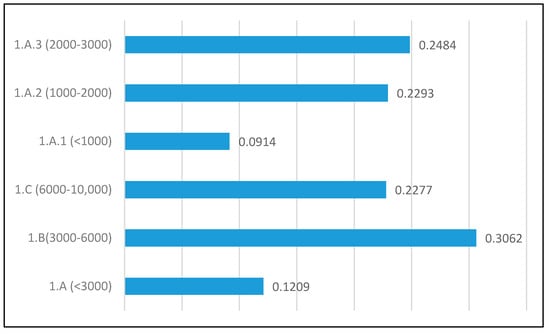 The objective is to analyze the behavior of smaller structures in order to corroborate the existence of economies of scale. The sample was divided into subgroups by specific volume ranges (Figure 1): 1.A (under 3000), 1.B (3000–6000), and 1.C (6000–10,000), with further breakdowns under 1.A into 1.A.1 (<1000), 1.A.2 (1000–2000), and 1.A.3 (2000–3000).