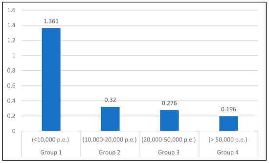 Continuing with the analysis of the smaller WWTPs, as shown in Figure 2, the following efficiencies are obtained: Group 1.A.1 (<1000 P.E.) obtains a score of 0.09; Group 1.A.2 (1000–2000 P.E.) records a score of 0.22, and, finally, Group 1.A.3 (2000–3000 P.E.) obtains a score of 0.24. However, the Kruskal–Wallis test corroborates that, with a significance of 0.479, the null hypothesis is accepted. This implies that there are no significant differences between Groups 1.A.1, 1.A.2, and 1.A.3: that is, for smaller WWTPs, the pattern of economies of scale is not met and, therefore, there is no clear relationship between the size of the WWTP and its efficiency.