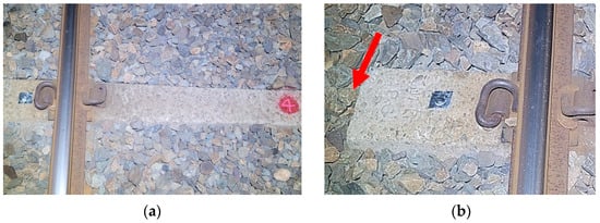 Representative examples of concrete sleepers. (a) Sleeper in good condition (#4); (b) poor gravel compaction; (c) sleeper with cracks (#3); (d) ballast fouling; (e) sleeper with cracks (#11).