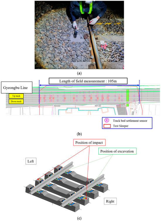 Accelerometers (PCB piezotronics, Depew, NY, USA) were installed on the top surface of the concrete sleepers to measure the acceleration resulting from the impact hammer (PCB piezotronics, Depew, NY, USA) strikes. Figure 2a shows an overview of the field measurements for the modal test, with the modal test measurement locations on the left and right sides of the concrete sleeper. Figure 2b is a schematic diagram of the sensor measurement location. Figure 2c provides details of the measurement locations.