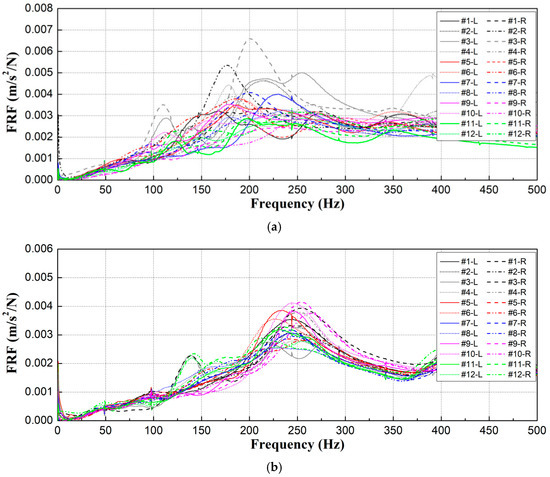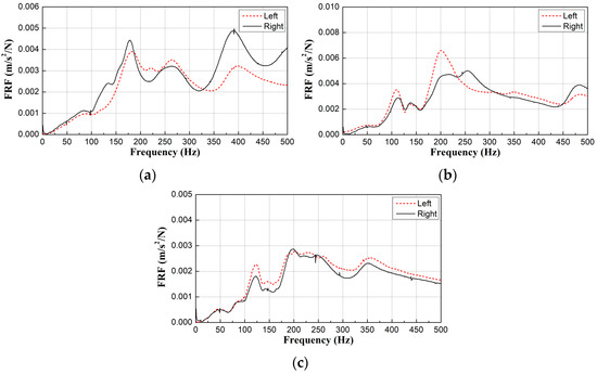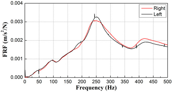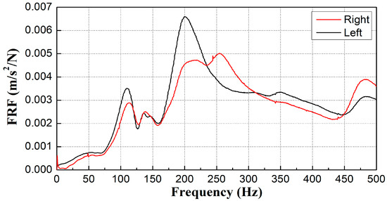 This study analyzed the natural frequencies according to the left and right under-sleeper support conditions using the FRFs measured in the field via modal testing, as shown in Figure 14. The measurement results are shown in Figure 15.