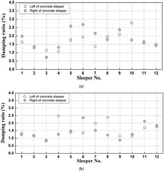 Damping ratio analysis results (pre-construction). (a) Up track; (b) down track.