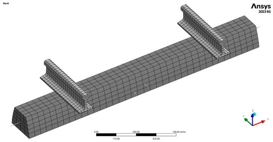 The structural analysis program Ansys Workbench Ver. 2023R1 was employed to analyze the natural frequencies of the track gauge, which are influenced by changes in the spring stiffness of the ballast beneath the sleepers [27]. The numerical analysis model is depicted in Figure 7, and the specifications used in the analysis are detailed in Table 3. In Figure 7, the length of the modeled rail is set to 625 mm, corresponding to the rail support spacing. The dimensions of the sleeper are width × height × length: (180 mm (top) − 280 mm (bottom)) × 200 mm × 2400 mm. As shown in Figure 8, the model incorporated spring elements to represent the gravel ballast and rail pads of the gravel-ballasted track.