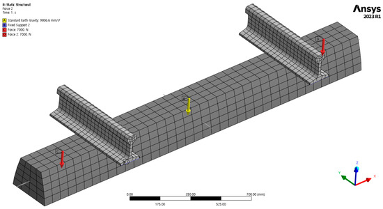According to KR C-14030 [28], the spring stiffness was set to 650 kN/mm for the rail pad and 200 kN/mm for well-compacted ballast. The loading conditions for the numerical analysis, detailed in Figure 9, included a force of 7000 N applied at the same points impacted by the modal test hammer in field tests. For vertical spring, the rail pad connects the lower rail and the upper part of the sleeper (body-to-body). The ballast sets the lower part of the sleeper and the ground (body-to-ground) as elastic support. The boundary condition is lower part of the rail end section as a fixed support.