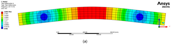 Additionally, the mode shapes of the gravel-ballasted sleepers were examined. The results for the first, second, and third bending modes under normal conditions are presented in Figure 11.