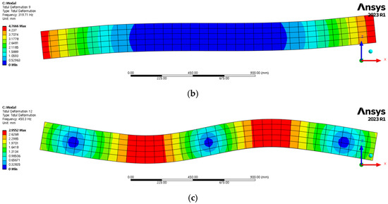 Analysis of the bending mode shapes of the gravel-ballasted sleepers under normal conditions indicated that the largest bending deformation occurred in the center of the sleeper at the first natural frequency of 247.73 Hz, as shown in Figure 11a. In the first mode, deformation was initiated directly beneath the rails on both sides. In contrast, the largest deformation at the second natural frequency of 319.71 Hz occurred on the outer part of the sleeper, as shown in Figure 11b. Additionally, at the third natural frequency of 450.3 Hz, significant deformations occurred between the center of the sleeper and directly beneath the rails on both sides, as depicted in Figure 11c.